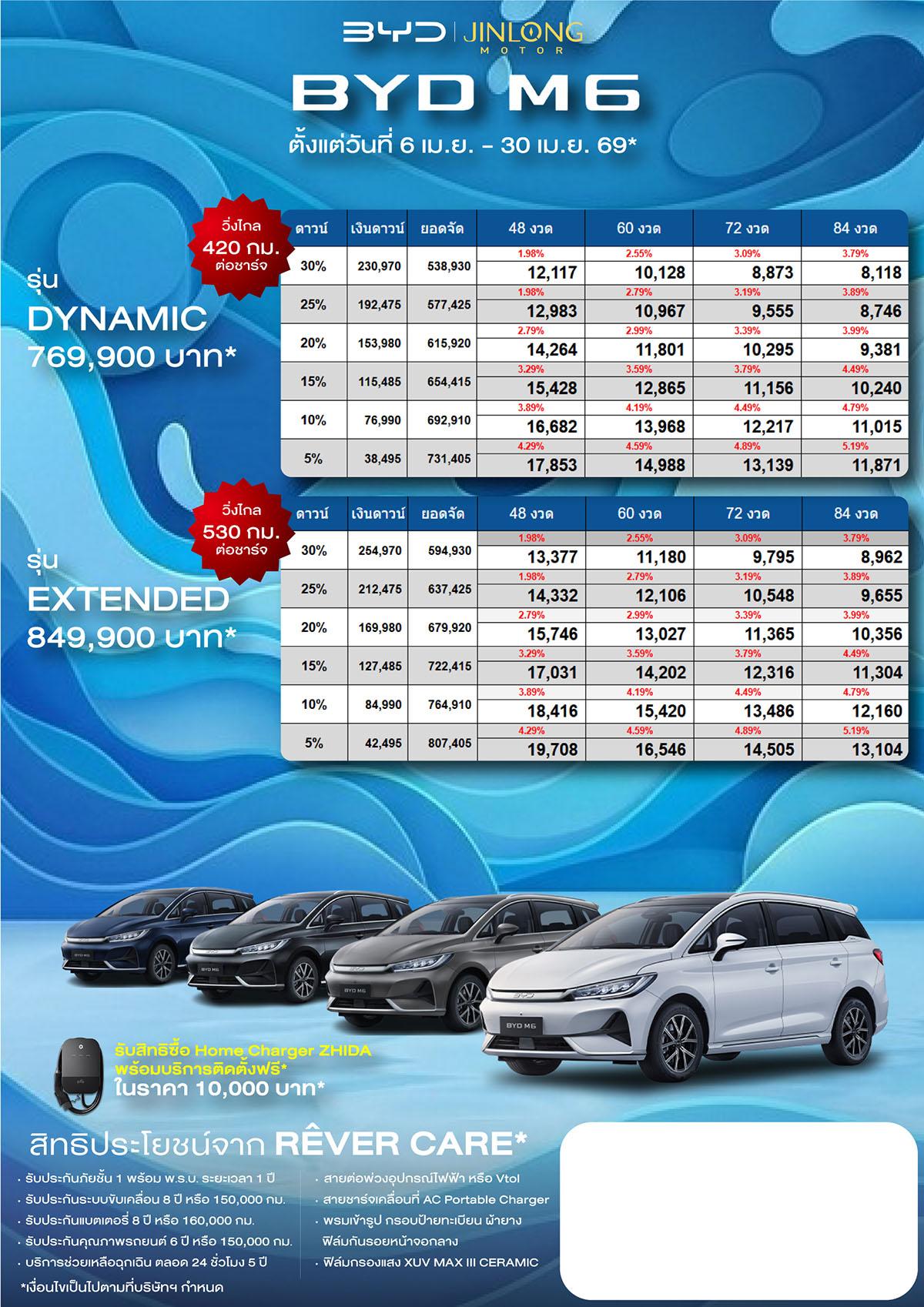 ราคาและตารางผ่อน BYD M6 ตั้งแต่วันที่ 6 เม.ย.69 – 30 เม.ย.69*