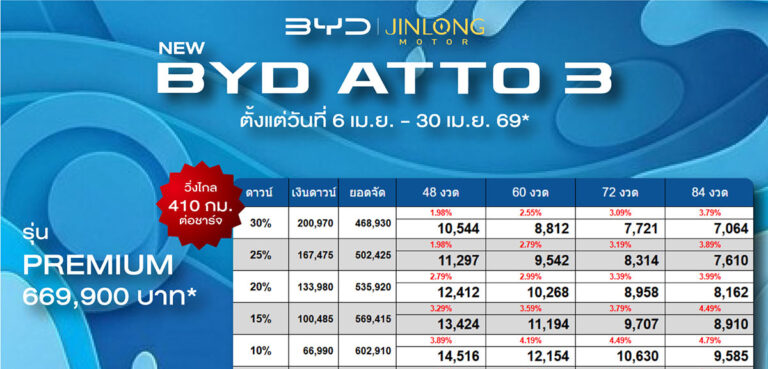 ราคาและตารางผ่อน NEW BYD ATTO 3 ตั้งแต่วันที่ 6 เม.ย. 69 – 5 เม.ย. 69