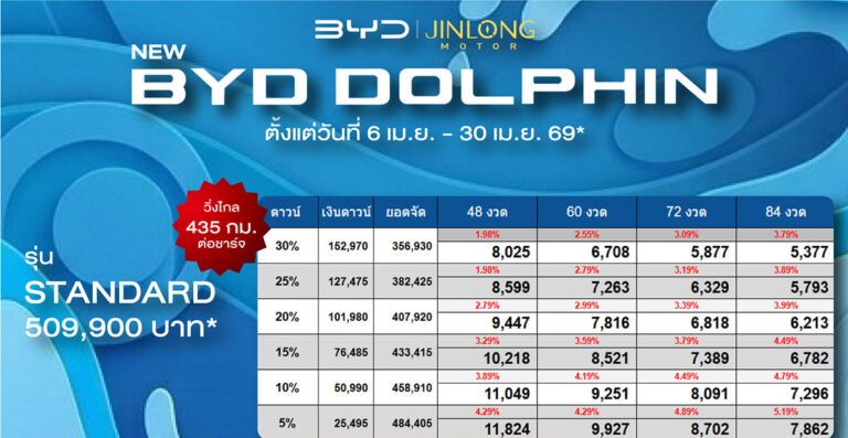 ราคาและตารางผ่อน NEW BYD DOLPHIN ตั้งแต่วันที่ 6 เม.ย.69 – 30 เม.ย.69*
