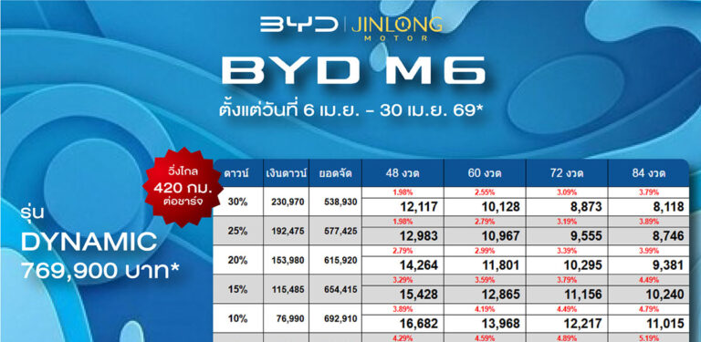 ราคาและตารางผ่อน BYD SEALION 6 DM-i ตั้งแต่วันที่ 6 เม.ย. 69 – 30 เม.ย. 69*