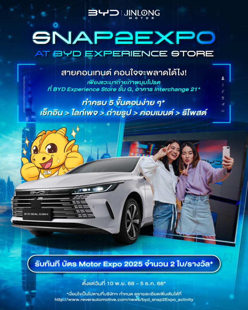 BYD จินหลงมอเตอร์ ขอชวนสายคอนเทนต์และคนที่อยากไปงาน มหรรมยานยนต์ครั้งที่ 42 (Motor Expo) มาร่วมสนุกกันได้ที่ BYD Experience Store ชั้น G ตึก Interchange 21 (อโศก)​ ให้คุณได้สัมผัสนวัตกรรมรถยนต์พลังงานใหม่จาก BYD​